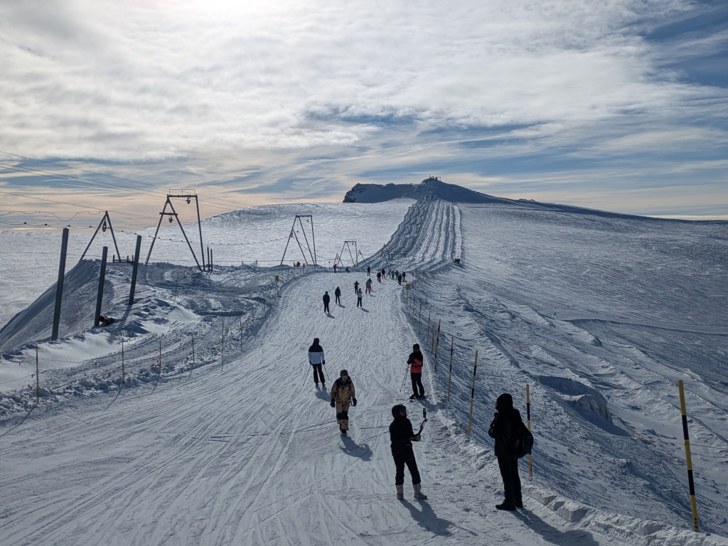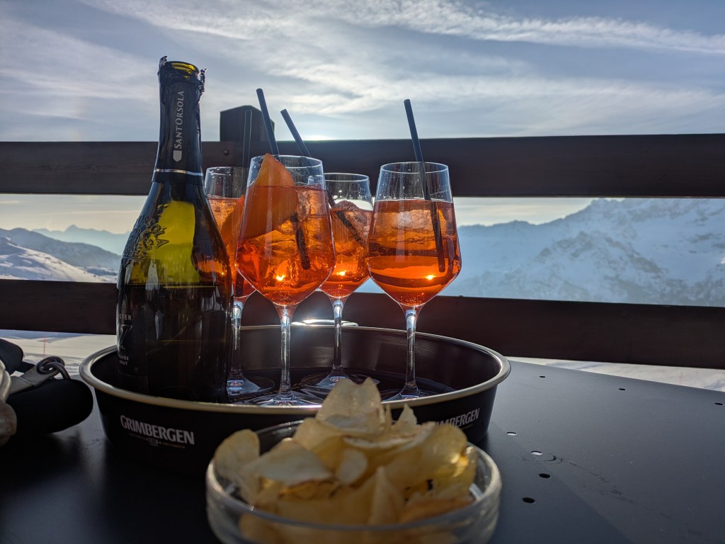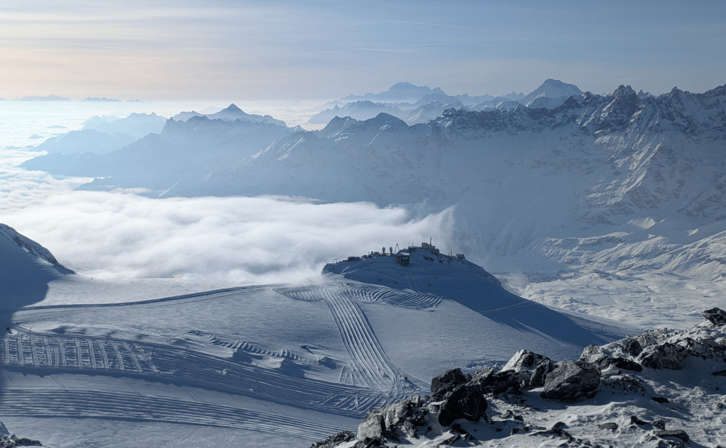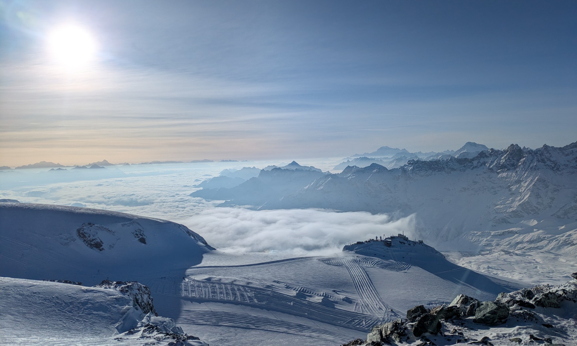 Eine kurze Skifahrt später steht man schon auf der Testa Grigia. Hier kommen die italienischen Skifahrer aus Breuil-Cervinia an. Eine Beschreibung erspare ich mir und zitiere stattdessen die NZZ, die das viel besser macht: «Die Testa Grigia könnte als Schauplatz eines Thrillers durchgehen. Massive Klötze thronen hoch oben, aufgereiht auf einem Felsgrat, der vor hundert Jahren noch von Eis bedeckt war. Alte Bergstationen, die schon lange keine Gondel mehr hochgezogen haben, die neue Bergstation aus zwei überdimensionierten grauen Säulen, die italienische Guardia di Finanza und die Schweizer Grenzwache, La Rotonda, eine runde Aussichtsplattform, die schon bessere Zeiten gesehen hat. Von hier aus würde der Bösewicht die Welt zerstören.» Hm ja, im Tschugger war es dann aber doch die Grand-Dixence-Staumauer.