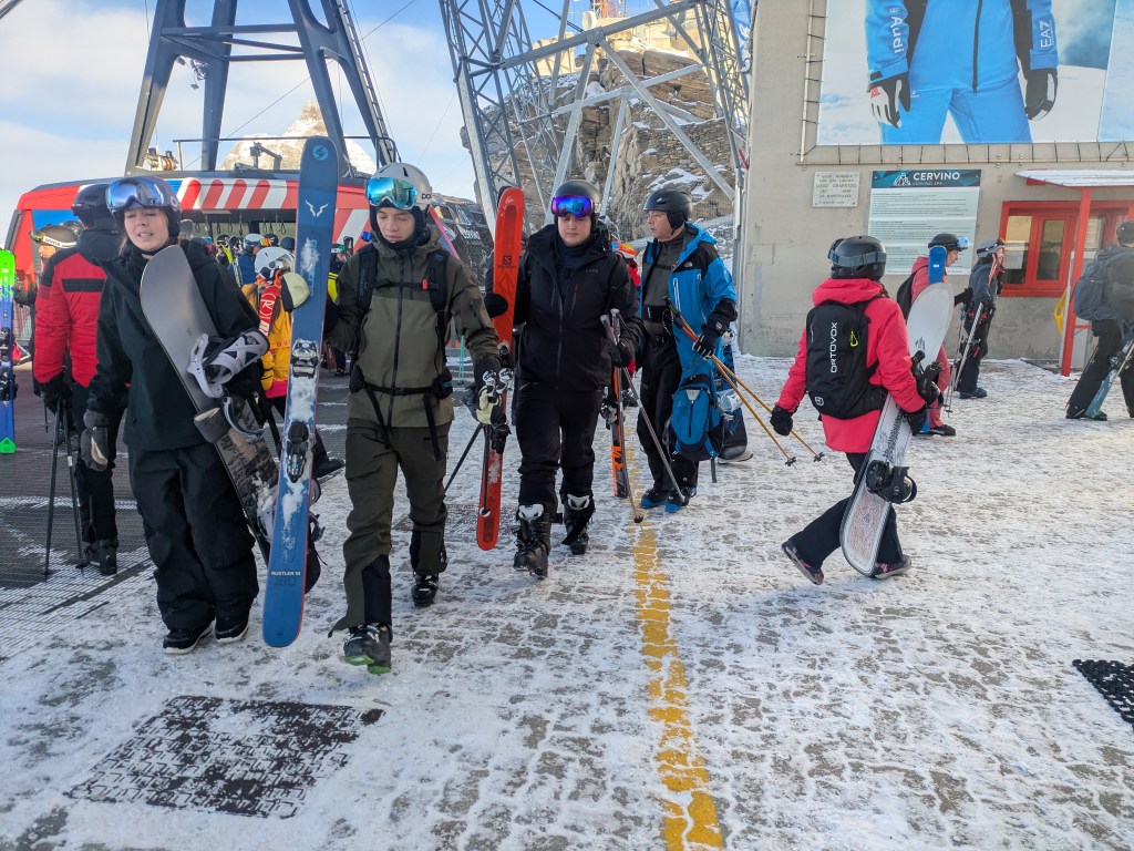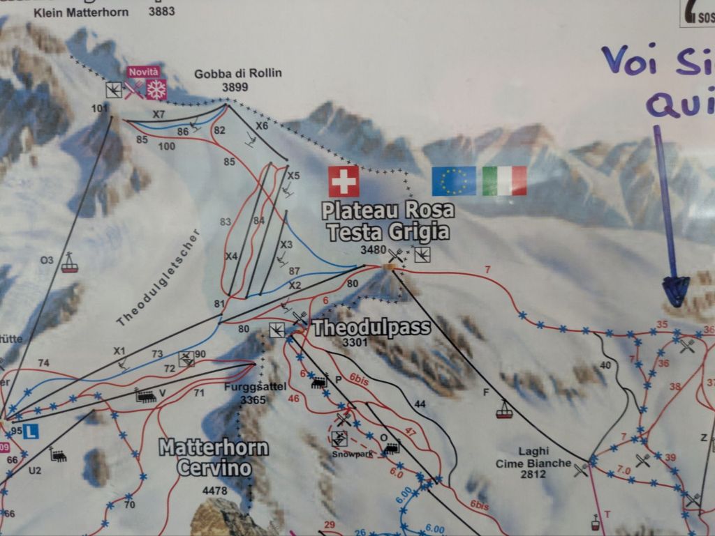 Wem Wintersport zu mühsam ist, kann die alpine Grenze seit 2023 auch zu Fuss überqueren. Dazu wurde extra eine neue Gondelbahn errichtet, welche die schweizerische Bergstation auf dem Klein Matterhorn mit der italienischen auf der Testa Grigia verbindet. Vermarktet wird das Angebot grossspurig als «Matterhorn Alpine Crossing». Doch es hat gleich mehrere Haken. Der wichtigste: die Seilbahn fährt fast nie. Warum auch immer. Jedesmal, wenn ich in Zermatt war, war sie geschlossen. Wochenlange Wartungsfenster. Ausserdem: sie ist deutlich teurer als die Grenzüberquerung per Ski. Die Tageskarte im internationalen Skigebiet kostet ca. 115 Fr. beim Kauf in Zermatt, ca. 80 Fr. beim Kauf in Italien. Die einmalige Fahrt über die Grenze für Fussgänger hingegen 128 Fr.! Die Bergbahnen begründen dies damit, dass es ein Sightseeing-Angebot sei, mit Eintritten zu Attraktionen unterwegs. Doch reine Transport-Tickets gibt es nicht. Sicherheitshalber hat man die Talfahrt der oberen beiden Gondelbahnen am Klein Matterhorn bei der Ski-Tageskarte gesperrt, damit kein Fussgänger auf die Idee kommt, sich als Skifahrer auszugeben…