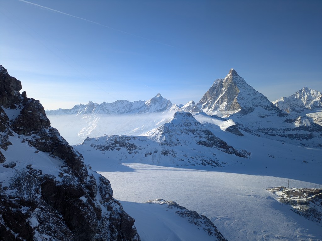 Es ist nicht nur der höchste Grenzübergang, sondern auch der schönste (zumindest der Schweiz). Nur schon die Anreise: 40 Minuten lang fährt man mit Gondel- und Seilbahnen von Zermatt auf das Klein Matterhorn. Die Aussichten auf das Matterhorn und die Gletscherwelt des Monte-Rosa-Massivs sind spektakulär. Zuletzt schwebt man in einer Gondelbahn über den Theodulgletscher, im Blick bereits das Felsplateau der Testa Grigia. 3883 Meter hoch ist das Klein Matterhorn, und damit die höchste Station in einem europäischen Skigebiet. Oben angekommen, durchquert man die Bergspitze in einem Tunnel (mühsam!) und tritt erneut mit einer überwältigenden Aussicht ans Tageslicht, diesmal in Richtung Aostatal und Piemont.